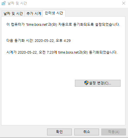설정 변경을 클릭 후 ntp 서버 주소를 입력합니다.