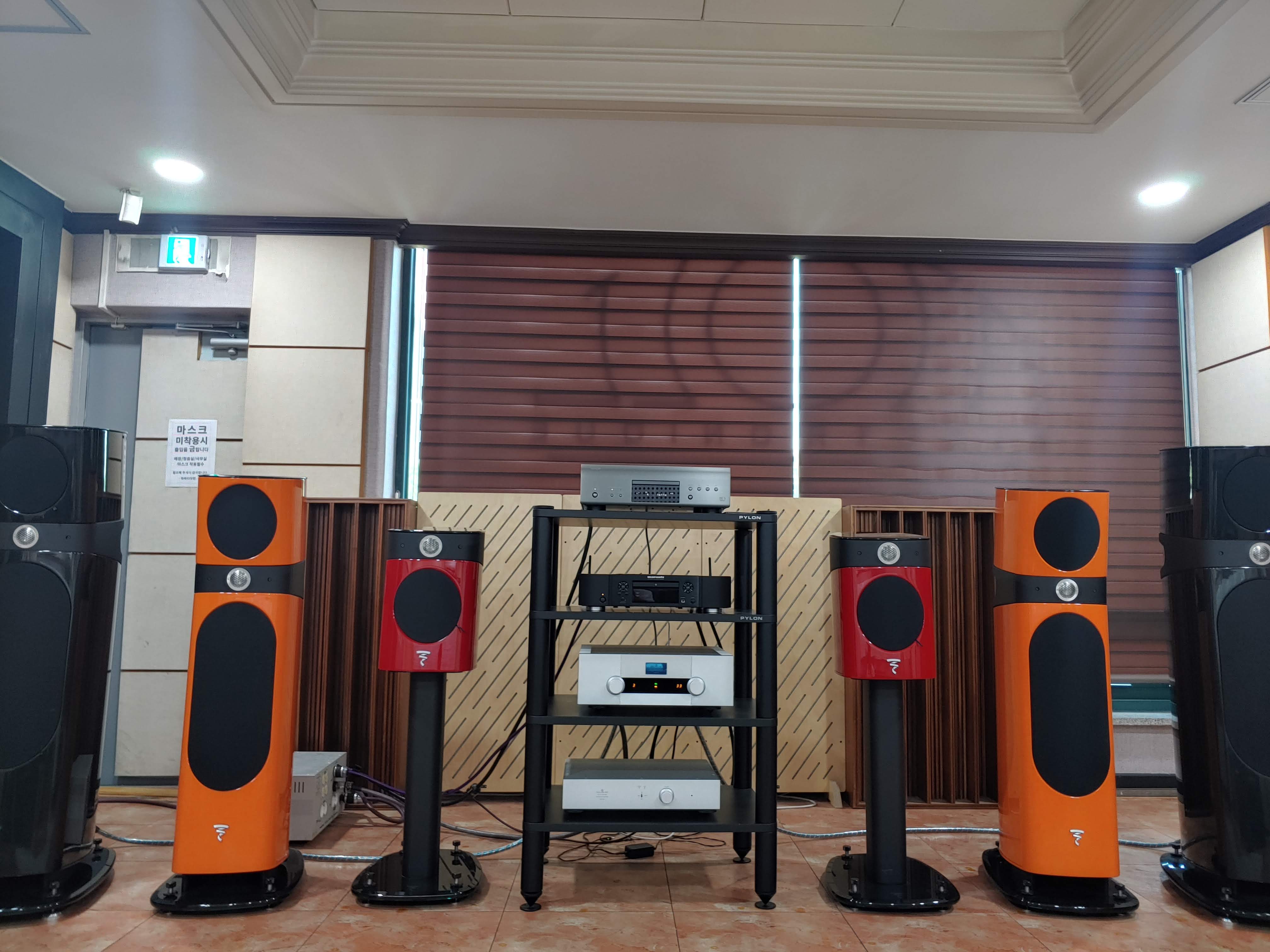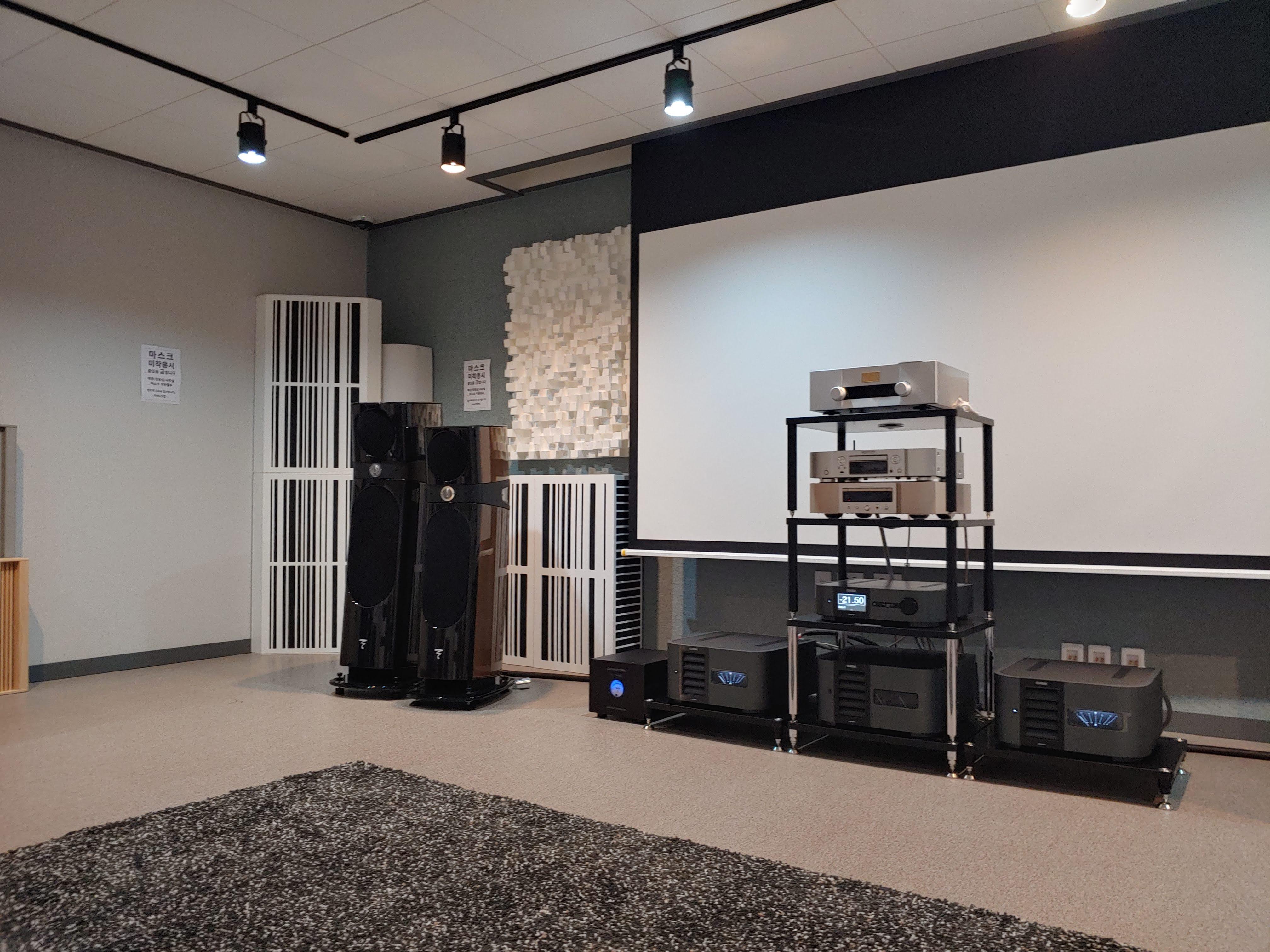 청음실은 포칼 위주로 배치하였습니다. (제가 본 스피커는 모니터오디오 , 홈씨어터룸에는 폴크, psb도 구비 되어 있었습니다)